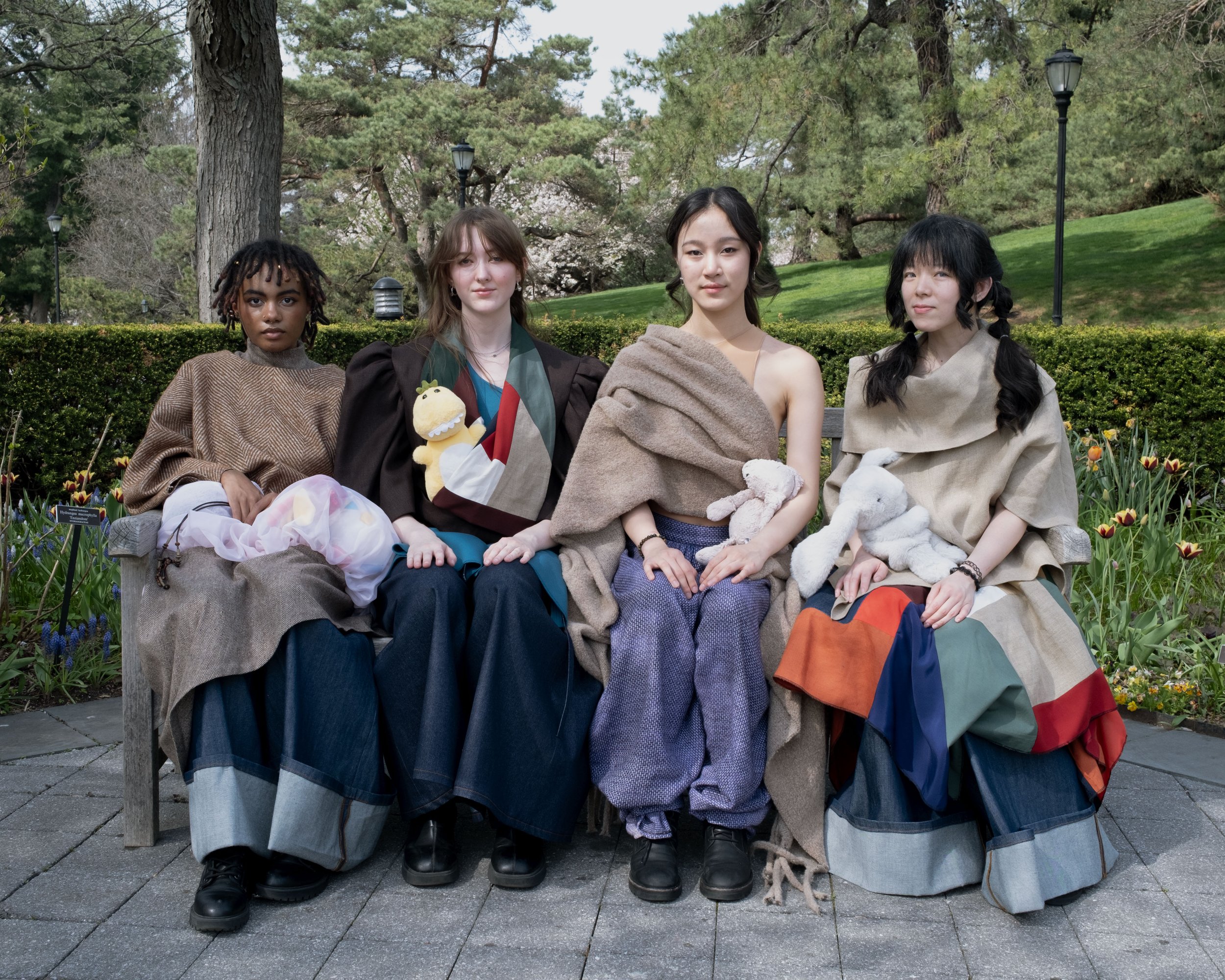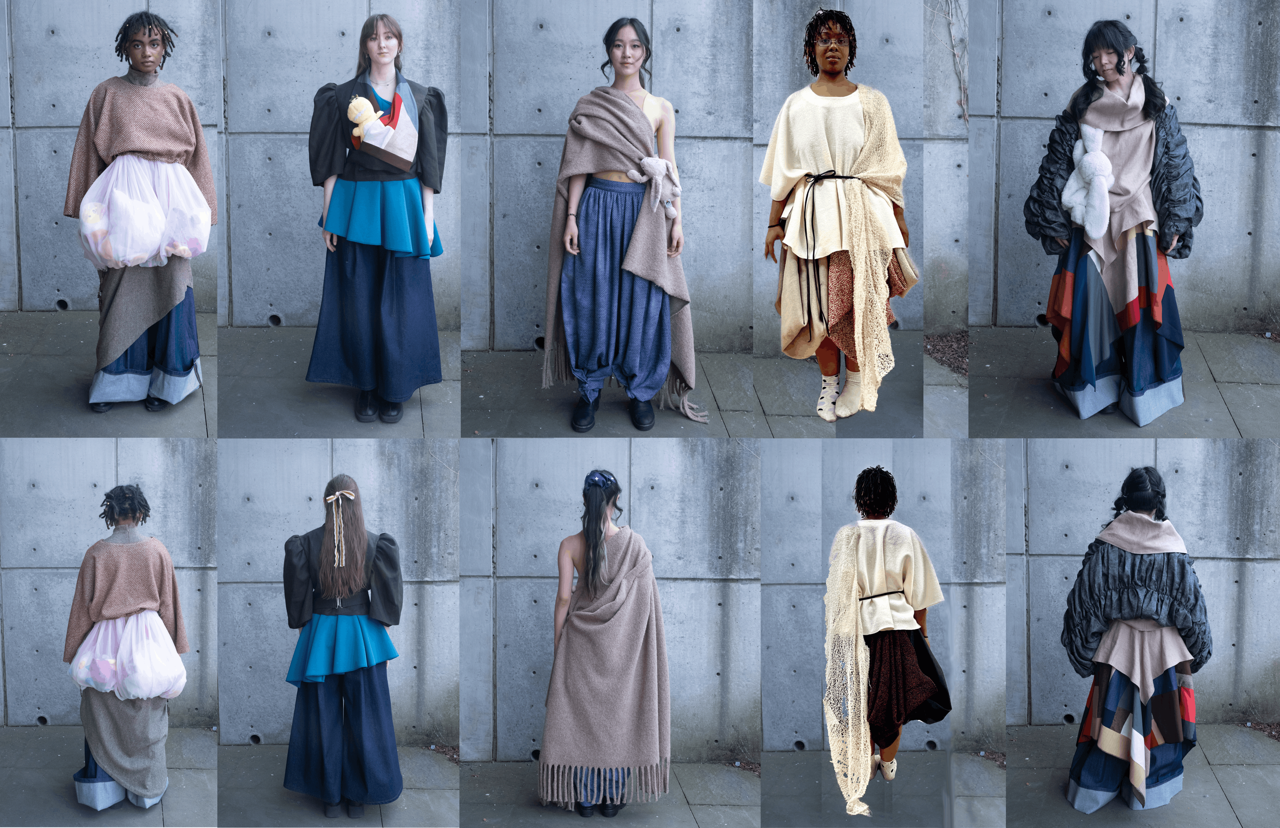 This collection, Carrying My Love, lives in a world where the era of capitalism has ended, and society has reverted to living nomadically. This collection follows the core principle of Nomadic cultures: traveling with only the necessary items, merging it with my stuffed animals, which are my necessities. I take inspiration from the silhouettes and textures from various nomadic cultures, such as Mongols, Tibetans, Uzbeks, etc., in my collection. To be sustainable, I have collected scraps from both my storage and others’ to create patchwork, and the stuffed animals used are also donated from friends or bought second-hand.